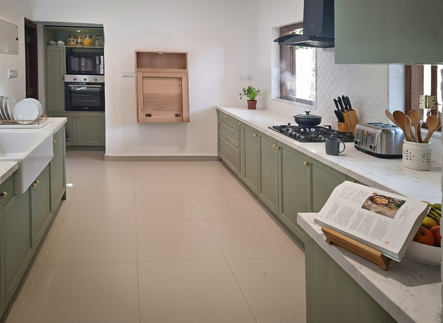 This kitchen features a modern, functional layout with soft green cabinetry and sleek white countertops. Natural light enhances the space, highlighting the organized open shelving and contemporary appliances. The fresh flowers add a welcoming touch, making the kitchen both stylish and inviting.
